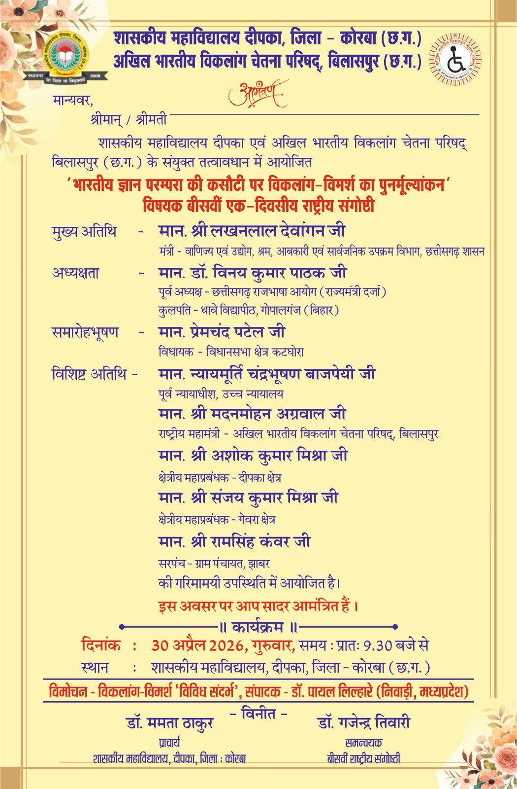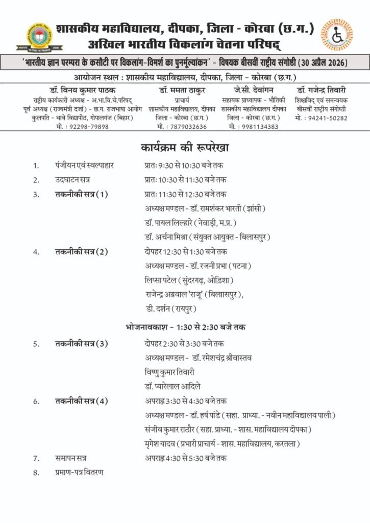 कोरबा। शासकीय महाविद्यालय दीपका, जिला कोरबा (छत्तीसगढ़) एक बार फिर राष्ट्रीय स्तर के बौद्धिक आयोजन का साक्षी बनने जा रहा है। महाविद्यालय एवं अखिल भारतीय विकलांग चेतना परिषद बिलासपुर के संयुक्त तत्वावधान में ‘भारतीय ज्ञान परंपरा की कसौटी पर विकलांग-विमर्श का पुनर्मूल्यांकनÓ विषय पर 20वीं एक दिवसीय राष्ट्रीय संगोष्ठी का आयोजन 30 अप्रैल 2026, गुरुवार को किया जाएगा।