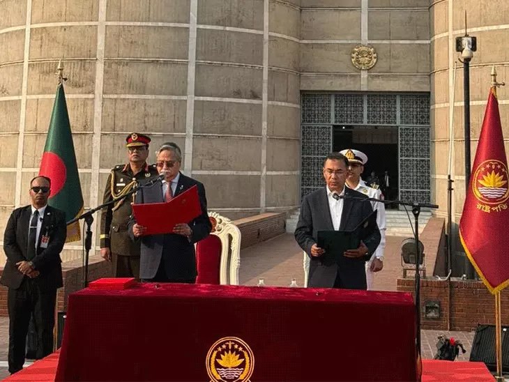राष्ट्रपति मोहम्मद शहाबुद्दीन ने तारिक रहमान को प्रधानमंत्री के तौर पर शपथ दिलाई। बाद में दोनों ने हाथ मिलाया।