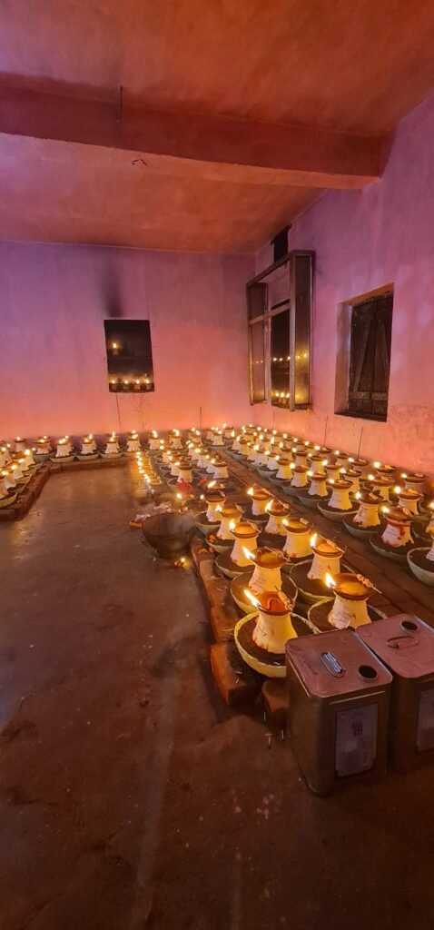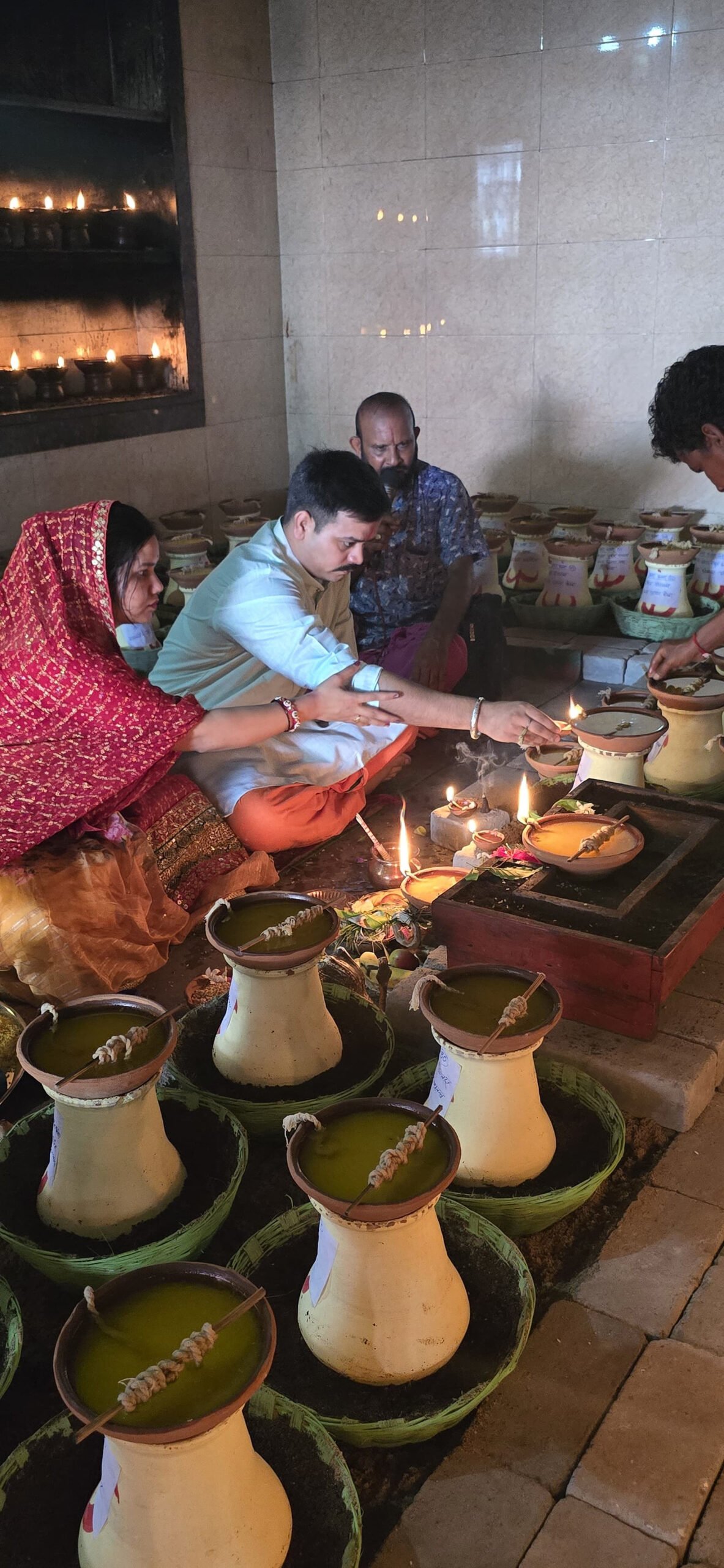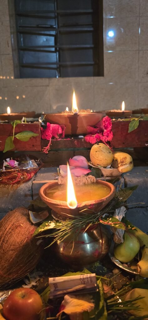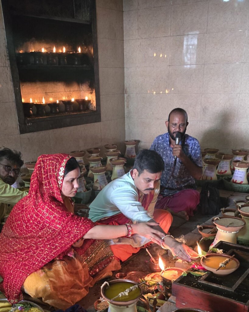 सर्व कल्याण एवं विश्व शांति की भावना के साथ दीप प्रज्ज्वलित करते श्रीमती एवं श्री नमन पांडेय