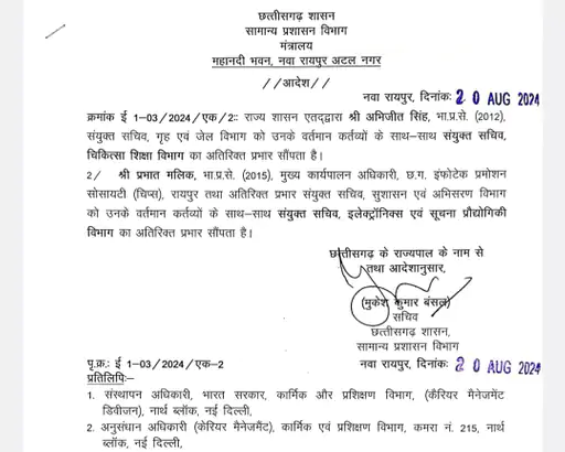 वहीं 2015 बैच के प्रभात मलिक को इलेक्ट्रॉनिक्स एवं सूचना प्रौद्योगिकी विभाग के संयुक्त सचिव का अतिरिक्त प्रभार दिया गया है। अभी वे चिप्स (छत्तीसगढ़ इंफोटेक प्रमोशन सोसाइटी) के CEO हैं। उनके पास सुशासन एवं अभिसरण विभाग का भी प्रभार है।