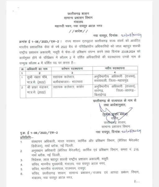 प्रोबेशन पीरियड में चल रहे नए IAS अफसरों को भी पोस्टिंग मिली है। 2022 बैच की अफसर बलौदाबाजार की सहायक कलेक्टर नम्रता चौबे को महासमुंद जिले में सरायपाली का SDM बनाया गया है। वहीं कांकेर के सहायक कलेक्टर प्रखर चंद्राकर को जिला सारंगढ़-बिलाईगढ़ में सारंगढ़ में SDM की जिम्मेदारी सौंपी गई है।