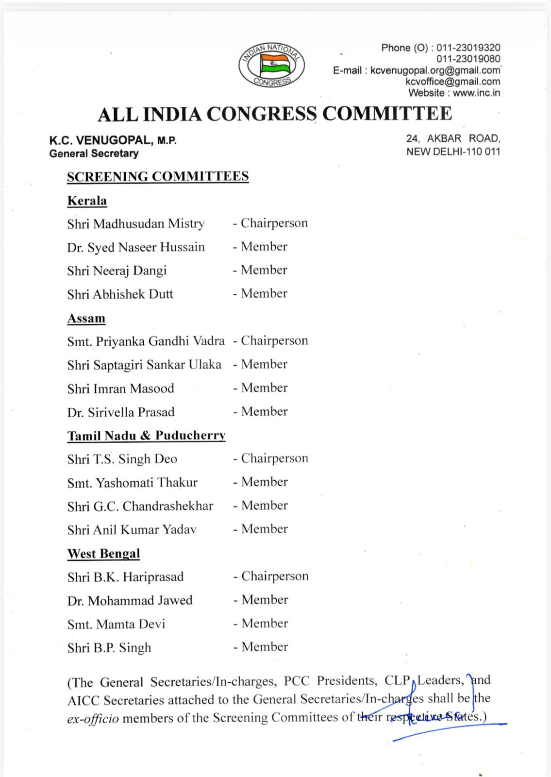 कांग्रेस की इस सूची में पार्टी महासचिव और वायनाड सांसद प्रियंका गांधी वाड्रा को भी अहम जिम्मेदारी दी गई है।कांग्रेस के संगठन महासचिव केसी वेणुगोपाल ने सोशल मीडिया प्लेटफॉर्म X पर इसकी आधिकारिक जानकारी दी। उन्होंने बताया कि राष्ट्रीय अध्यक्ष मल्लिकार्जुन खरगे ने प्रियंका गांधी वाड्रा को असम के लिए गठित स्क्रीनिंग कमेटी का चेयरपर्सन नियुक्त किया है।