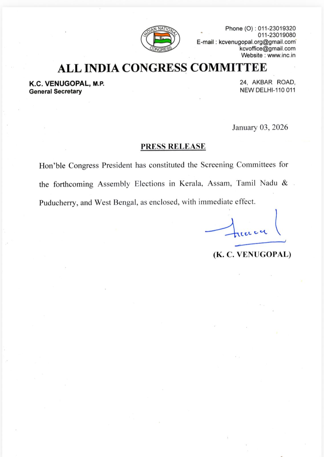साल 2026 में तमिलनाडु, केरल, असम, पुडुचेरी और पश्चिम बंगाल में विधानसभा चुनाव होने हैं। इसे लेकर कांग्रेस ने अभी से संगठनात्मक तैयारी शुरू कर दी है। इसी कड़ी में पार्टी ने उम्मीदवार चयन की अहम प्रक्रिया के लिए स्क्रीनिंग कमेटियों का गठन किया है और वरिष्ठ नेताओं को जिम्मेदारी दी है।