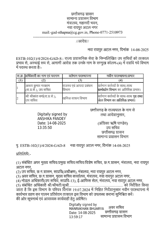 छत्तीसगढ़ में दो अधिकारियों को मिला अतिरिक्त प्रभार:अरुण को राजस्व-आपदा प्रबंधन की कमान, खनिज-जेल संभालेंगे श्रीकांत, आदेश जारी