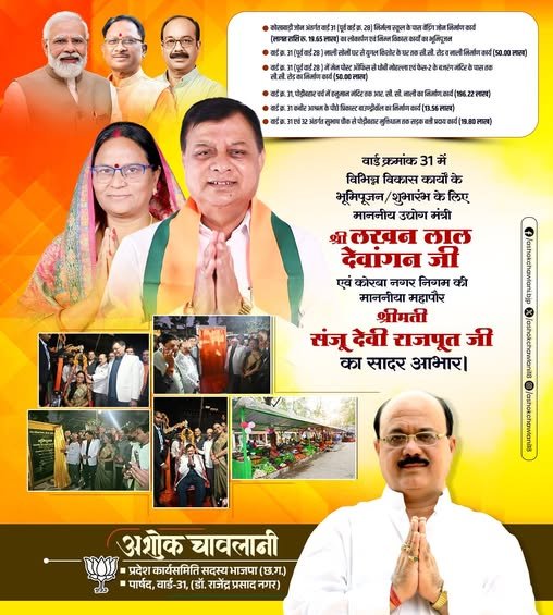 कैबिनेट मंत्री लखनलाल देवांगन के करकमलों से वार्ड क्र. 31 में जिन कार्यो का भूमिपूजन किया गया, उनमें वार्ड क्र. 31 अंतर्गत सोनी के घर से युगल किशोर के घर तक 50 लाख रूपये की लागत से सी.सी. रोड व नाली निर्माण, वार्ड क्र. 31 अंतर्गत मेन पोस्ट आफिस से धोबी मोहल्ला एवं फेस-2 के बजरंग मंदिर के पास तक 50 लाख रूपये की लागत से सी.सी. रोड का निर्माण, वार्ड क्र. 31 पोड़ीबहार चर्च में हनुमान मंदिर तक 01 करोड़ 96 लाख 22 हजार रूपये की लागत से आर.सी.सी. नाली का निर्माण, वार्ड क्र. 31 अंतर्गत कबीर आश्रम के पीछे 13 लाख 56 हजार रूपये की लागत से प्रीकास्ट बाउण्ड्रीवाल का निर्माण तथा वार्ड क्र. 31 एवं 32 अंतर्गत सुभाष चौक से पोड़ी-बहार मुक्तिधाम तक 19 लाख 80 हजार रूपये की लागत से सड़क बत्ती प्रदाय कार्य शामिल हैं।