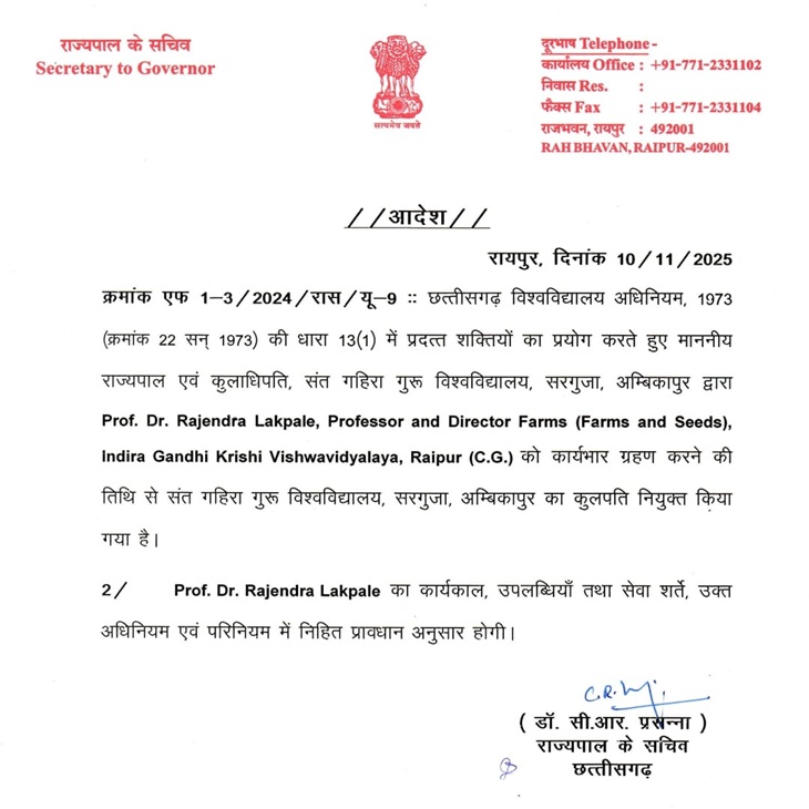 राज्यपाल के सचिव डॉ. सीआर प्रसन्ना की तरफ से जारी आदेश में कहा गया है कि, डॉ. राजेंद्र लखपाले की नियुक्ति कार्यभार ग्रहण करने की तिथि से प्रभावशील होगी। उनका कार्यकाल, उपलब्धियां और सेवा शर्तें छत्तीसगढ़ विश्वविद्यालय अधिनियम, 1973 और संबंधित परिनियमों के अनुरूप निर्धारित होंगी।