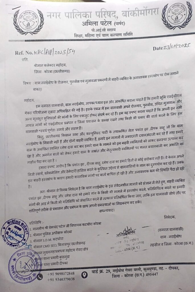 कोरबा। एसईसीएल गेवरा परियोजना से प्रभावित ग्राम नराईबोध के समस्त ग्रामवासियों ने अपने रोजगार, पुनर्वास और मुआवजा प्रकरणों में हो रहे बाहरी हस्तक्षेप को लेकर गंभीर आपत्ति दर्ज कराई है। ग्रामीणों ने एकजुट होकर जिला कलेक्टर, कोरबा को एक ज्ञापन सौंपा है, जिसमें उन्होंने कुछ बाहरी व्यक्तियों पर उनके आंदोलन को निजी स्वार्थ के लिए हाईजैक करने का आरोप लगाया है ।