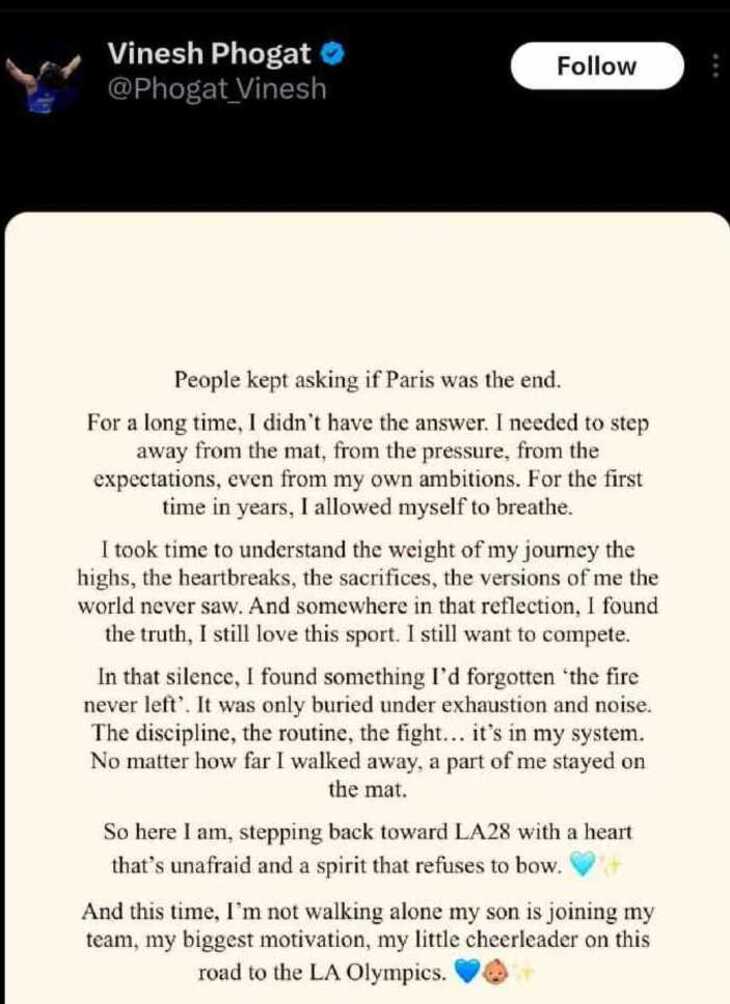 इस बार मैं अकेली नहीं चल रही हूं : उन्होंने आगे लिखा- उस खामोशी में मुझे कुछ ऐसा मिला जिसे मैं भूल गई थी ‘आग कभी खत्म नहीं होती’। यह सिर्फ थकान और शोर के नीचे दब गया था। डिसिप्लिन, रूटीन, लड़ाई… यह सब मेरे सिस्टम में है। मैं कितना भी दूर चली जाऊं, मेरा एक हिस्सा मैट पर बना रहा। तो मैं यहां हूं, LA28 की ओर एक ऐसे दिल के साथ वापस कदम बढ़ा रही हूं जो निडर है और एक ऐसी भावना जो झुकने से मना करती है। और इस बार मैं अकेली नहीं चल रही हूं, मेरा बेटा मेरी टीम, मेरी सबसे बड़ी प्रेरणा, LA ओलिंपिक के इस रास्ते पर मेरे छोटे चीयरलीडर के साथ शामिल हो रहा है।