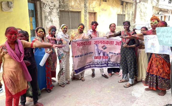 कोरबा । कलेक्टर एवं जिला निर्वाचन अधिकारी अजीत वसंत के निर्देशन में आगामी लोकसभा चुनाव में मतदान प्रतिशत बढ़ाने तथा शतप्रतिशत मतदान के लक्ष्य को प्राप्त करने हेतु स्वीप गतिविधियों के अंतर्गत नियमित रूप से मतदाता जागरूकता कार्यक्रम जिले में जारी हैं। इसी कड़ी में शासकीय ईवीपीजी महाविद्यालय के एनएसएस और ईएलसी क्लब के द्वारा होली के अवसर पर मतदाता जागरूकता कार्यक्रम के अंतर्गत मतदान को प्रेरित करने वाले आकर्षक रंगोली एवं मेहंदी बनाकर लोगों को मतदान के प्रति जागरूक किया गया। इसी प्रकार कमला नेहरू महाविद्यालय के ईएलसी क्लब के सदस्यों द्वारा रंगो के त्यौहार में घर-घर जाकर मतदाता जागरूकता अभियान चलाया गया। अभियान के माध्यम से आमजनों को मतदान की उपयोगिता की जानकारी देते हुए लोकतंत्र की मजबूती में अपना योगदान देने हेतु प्रेरित किया जा रहा है। इस दौरान महाविद्यालय के छात्र-छात्राओं द्वारा आमजनों को अनिवार्य मतदान हेतु मतदाता जागरूकता की शपथ दिलाई गयी।