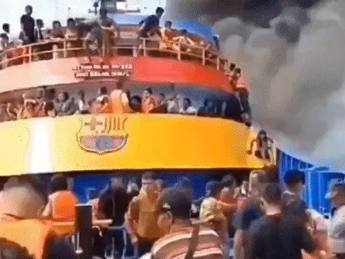इंडोनेशिया में पानी के यात्री जहाज में आग:जान बचाने समुद्र में कूदे लोग, 3 की मौत, 280 लोग सवार थे
