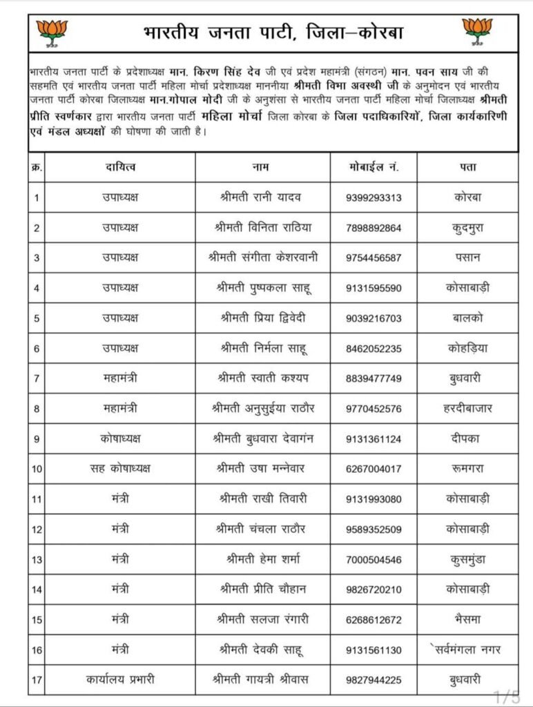 इन नई नियुक्तियों पर भाजपा जिला पदाधिकारियों ने प्रसन्नता व्यक्त करते हुए कहा कि अनुसुईया राठौर और अमृता यादव जैसे ऊर्जावान चेहरों को आगे लाने से संगठन की कार्यक्षमता में इजाफा होगा। यह निर्णय नारी शक्ति के सशक्तिकरण और पार्टी की रीति-नीति को विस्तार देने की दिशा में एक बड़ा कदम है ।
