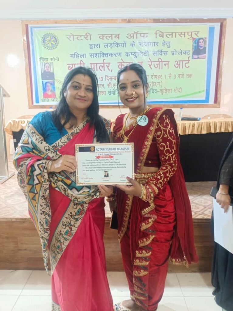 बिलासपुर। महिला सशक्तिकरण को बढ़ावा देने के उद्देश्य से महिला सशक्तिकरण कम्युनिटी सर्विस प्रोजेक्ट के तत्वावधान में ब्यूटी पार्लर, केक मेकिंग एवं रेजिन आर्ट का चार दिवसीय प्रशिक्षण शिविर रोटरी भवन, बिलासपुर में आयोजित किया गया। इस प्रशिक्षण शिविर में बड़ी संख्या में युवतियों एवं महिलाओं ने भाग लेकर विभिन्न हुनर सीखकर आत्मनिर्भरता की दिशा में कदम बढ़ाया।