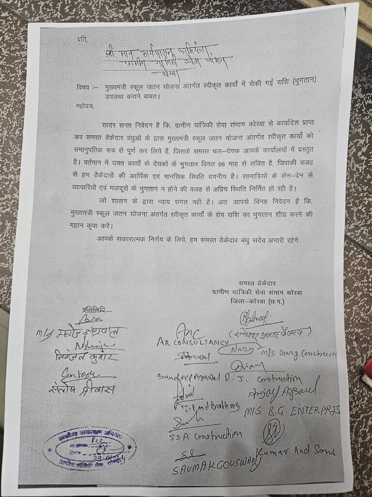 ग्रामीण यांत्रिकी सेवा संभाग कोरबा के ठेकेदार परेशान, ईई को सौंपा ज्ञापन