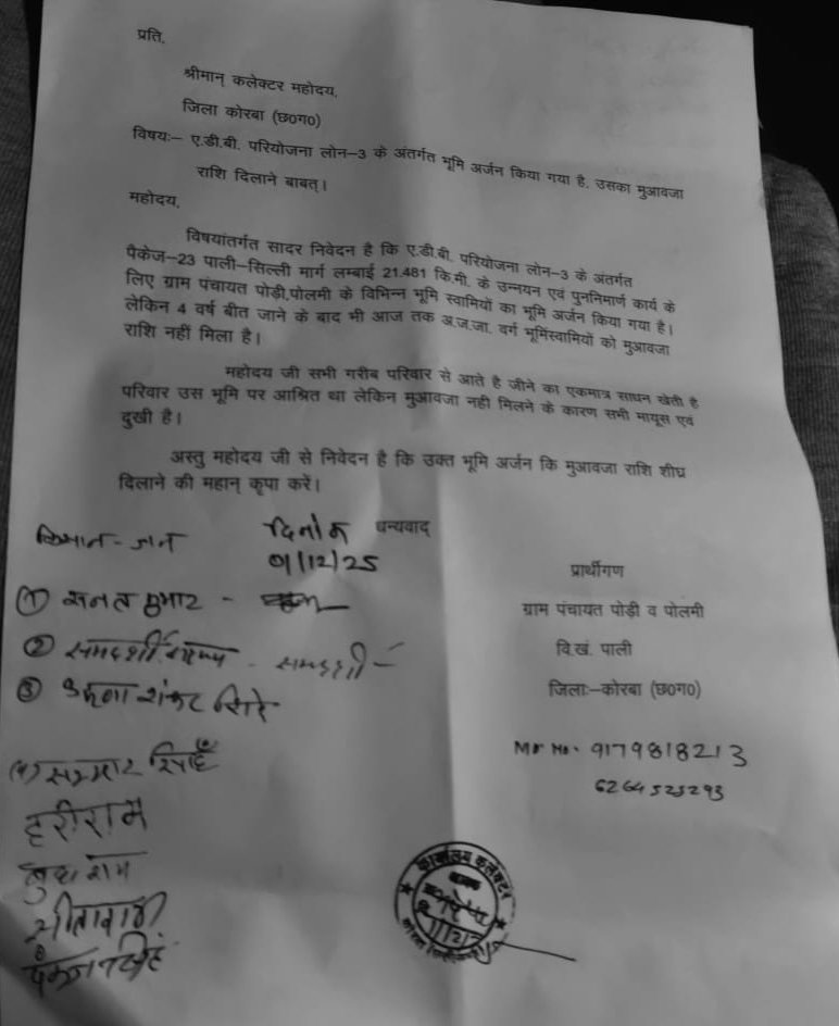कोरबा/पाली। एडीबी परियोजना लोन-3 के अंतर्गत पैकेज-23 के तहत 21.481 किलोमीटर पाली-सिल्ली सड़क निर्माण के लिए पाली से लेकर सिल्ली तक सैकड़ों ग्रामीणों की जमीन सड़क में अधिग्रहित की गई थी। सड़क के लिए जमीन अधिग्रहण किए चार साल बीत गए, सड़क निर्माण भी हो गया, किन्तु ग्राम पंचायत पोड़ी एवं ग्राम पंचायत पोलमी के लगभग 82 किसानों को अब तक मुआवजा नहीं मिल पाया है।