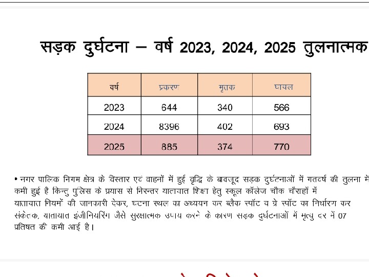 जिले में सड़क दुर्घटनाओं के आंकड़े चिंताजनक हैं। वर्ष 2023 में 644 सड़क दुर्घटनाएं दर्ज की गईं, जिनमें 340 लोगों की मौत हुई और 566 लोग घायल हुए। वर्ष 2024 में 8396 प्रकरण सामने आए, जिनमें 402 लोगों की जान गई और 693 लोग घायल हुए। इसी तरह, वर्ष 2025 में 885 दुर्घटनाएं हुईं, जिनमें 374 लोगों की मौत हुई और 770 लोग घायल हुए।