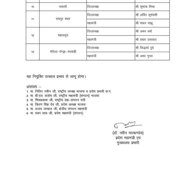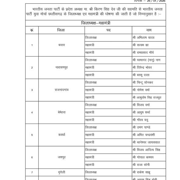 कार्यकर्ताओं ने विश्वास व्यक्त किया कि वैभव शर्मा और मोंटी पटेल के नेतृत्व में युवा मोर्चा कोरबा जिले में युवाओं को संगठित कर संगठन विस्तार और जनसेवा के कार्यों को नई गति देगा। बताया जा रहा है कि भाजयुमो जिलाध्यक्ष पद के लिए कई नाम चर्चा में थे।